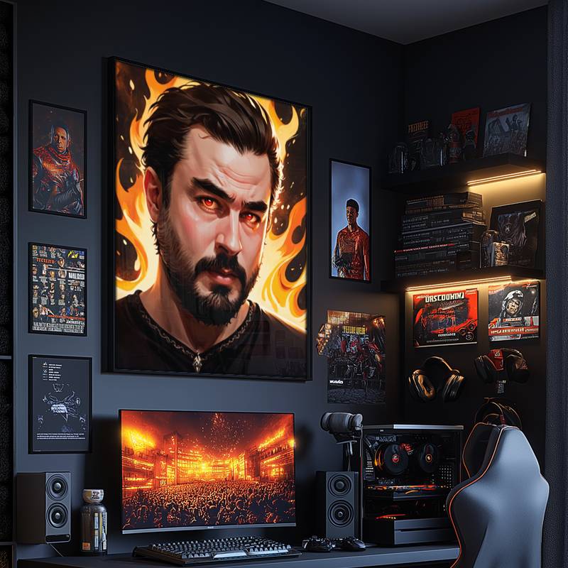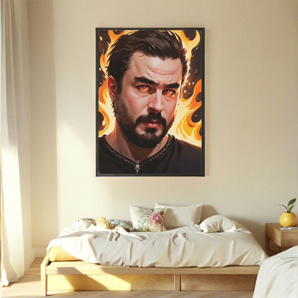 Chaos Incarné présente un personnage puissant et captivant, dont les yeux ambrés semblent briller d’un feu intérieur presque surnaturel. Ce regard intense est encadré par un fond de flammes vives, projetant une lueur chaude et enveloppante qui symbolise à la fois la force et le mystère. Avec des marques rouges subtiles sur le visage et un sourire en coin à la fois confiant et provocateur, le sujet de cette œuvre incarne la résilience, l’audace et un brin de rébellion. L’attention portée aux détails numériques et la palette de couleurs riche et intense confèrent à cette œuvre un réalisme vibrant qui capte le regard et attire immédiatement l’observateur dans un univers de chaos contrôlé et de charisme indomptable. Ce tirage encadré de taille moyenne est spécialement conçu pour apporter une énergie audacieuse et dynamique dans des espaces personnels comme les chambres et les salles de jeu. Ses tons chauds et son design percutant en font une pièce maîtresse idéale pour ceux qui cherchent à exprimer leur individualité à travers leur décoration. Cette œuvre attire naturellement l'attention et crée une ambiance captivante, parfaite pour des espaces où l'on vient se ressourcer, se divertir ou s’évader dans un monde de créativité. Que vous soyez un gamer passionné, un créatif en quête d’inspiration, ou simplement quelqu’un qui apprécie la déco unique et percutante, Chaos Incarné transforme l’atmosphère de la pièce en y insufflant intensité et caractère. Envie de voir cette énergie puissante dans votre propre portrait ? Téléchargez dès maintenant une photo de vous ou d’un être cher, et laissez la magie opérer ! En quelques secondes, votre image se transformera en une œuvre d’art unique, pleine d’intensité et de caractère, dans le style captivant de Chaos Incarné. N'attendez plus : créez un portrait qui surprend, captive, et qui apportera une touche personnelle et percutante à votre espace. | Cliquez sur les images pour les agrandir |